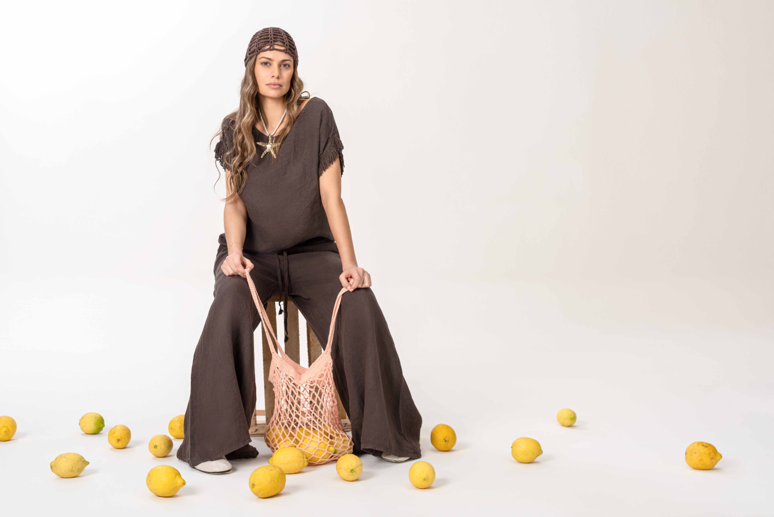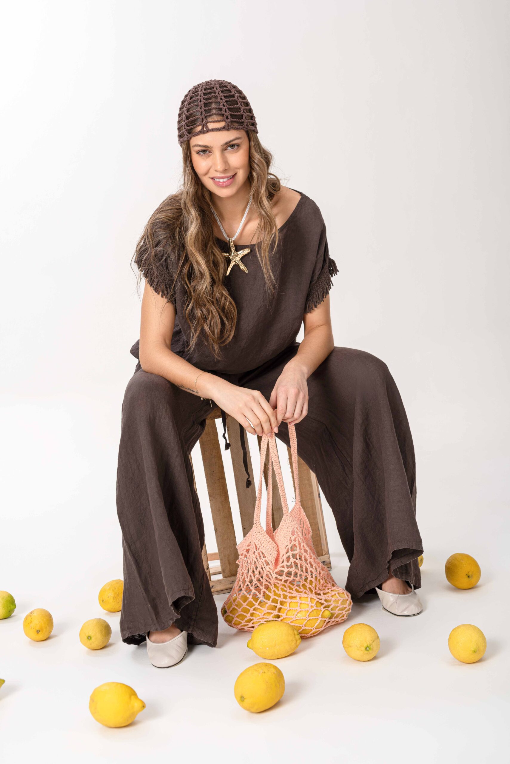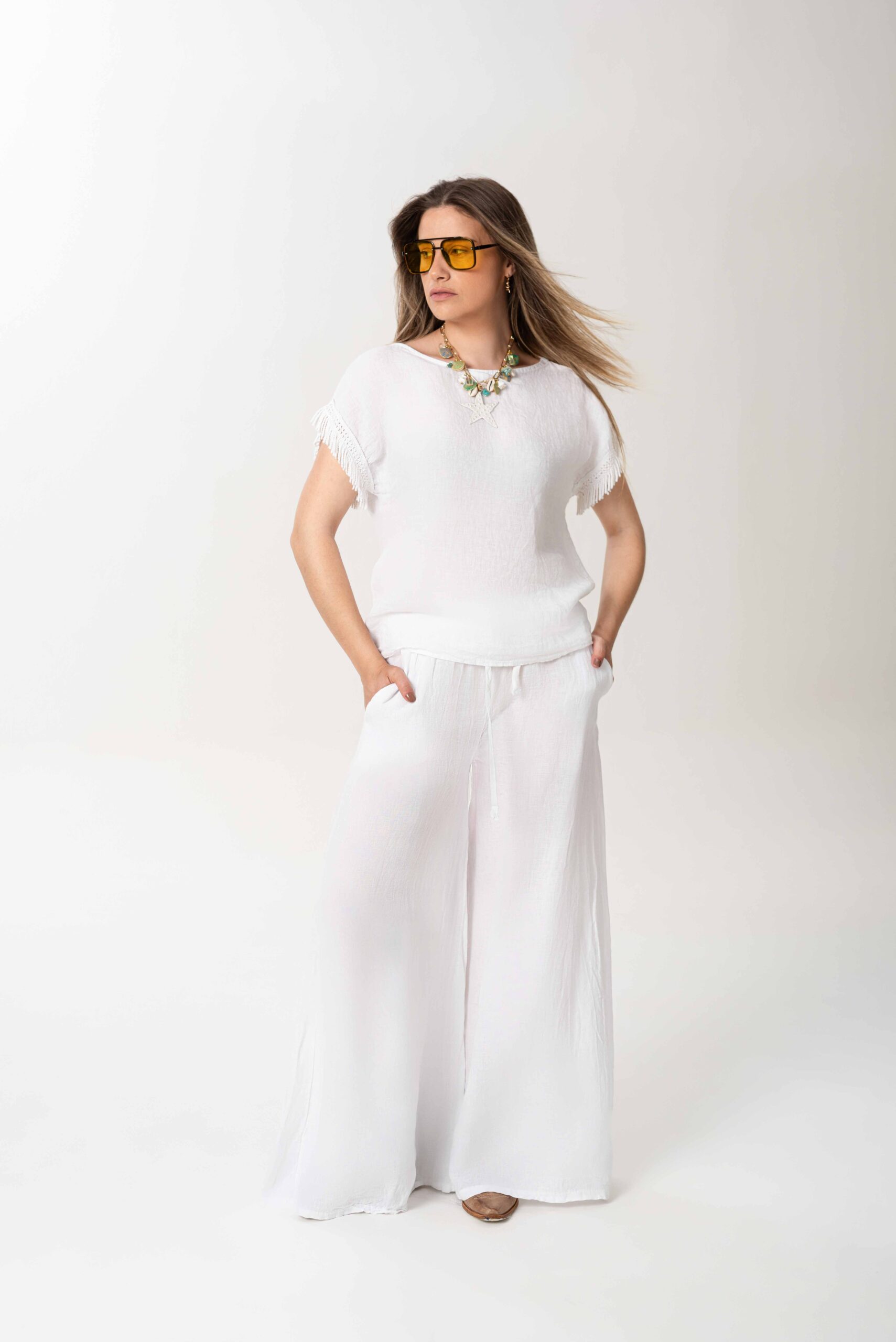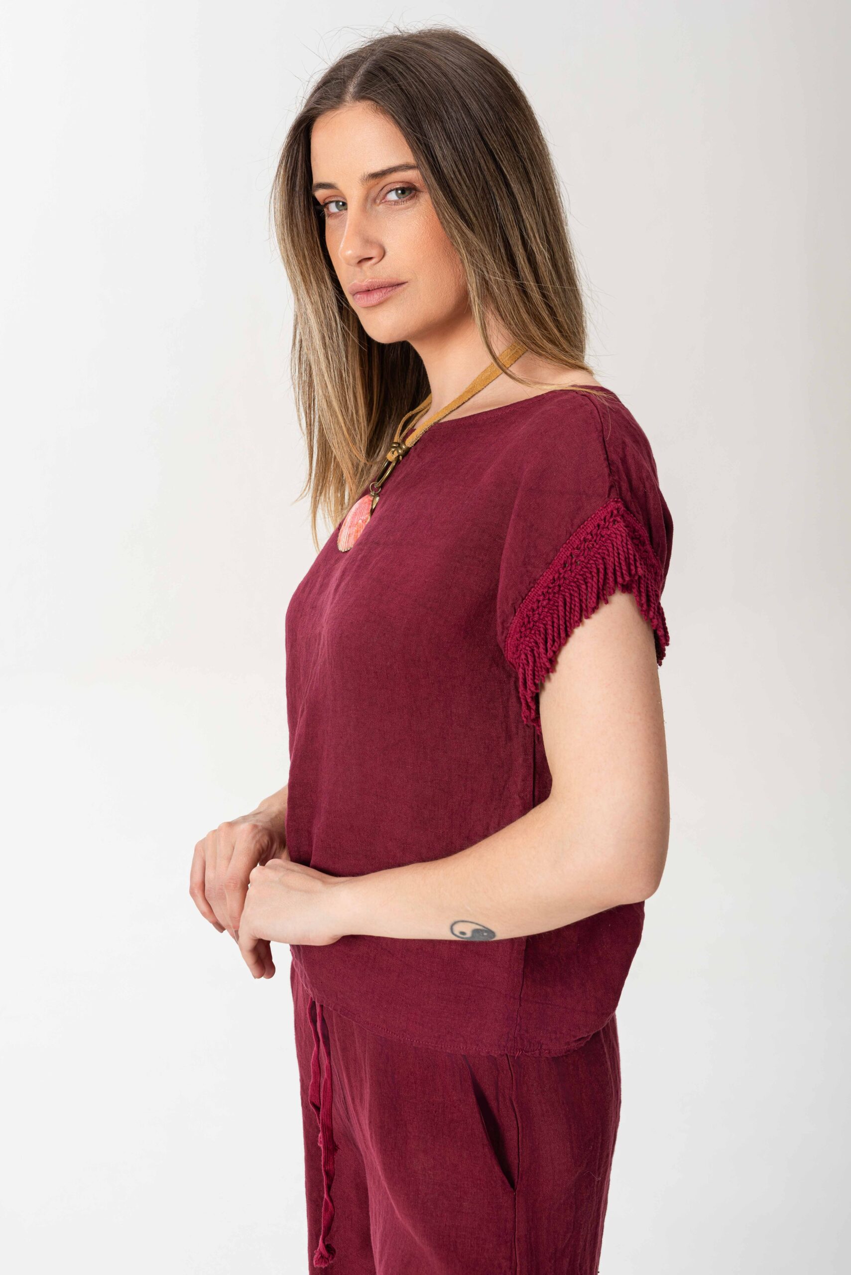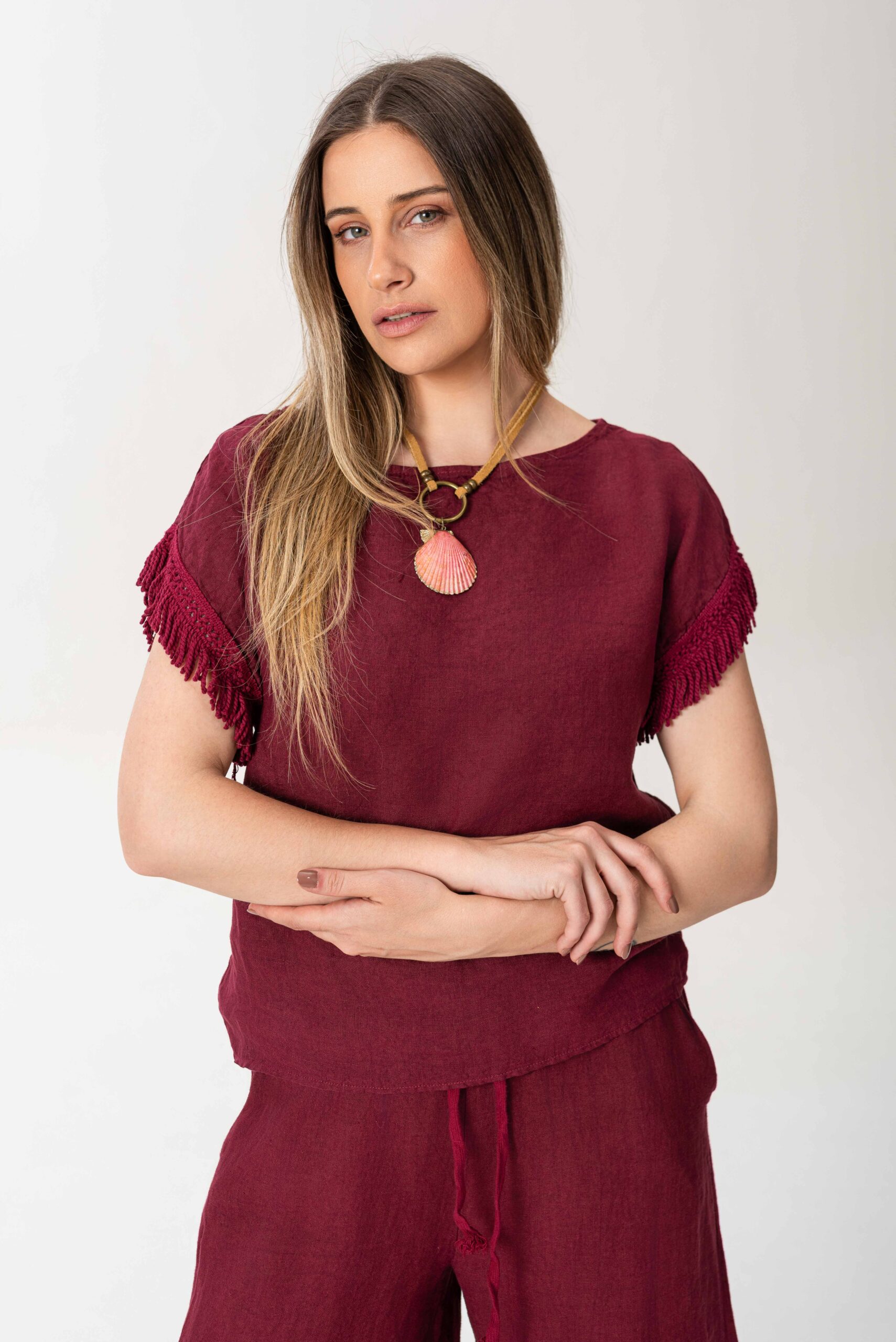 Blusa en 100% lino con detalle de felcos en las mangas. Muy Cnchera y ponible, hace juego con el Pantalón Adriano. Talle único, medidas, 100 cms de contorno de busto x 60 cms de largo.