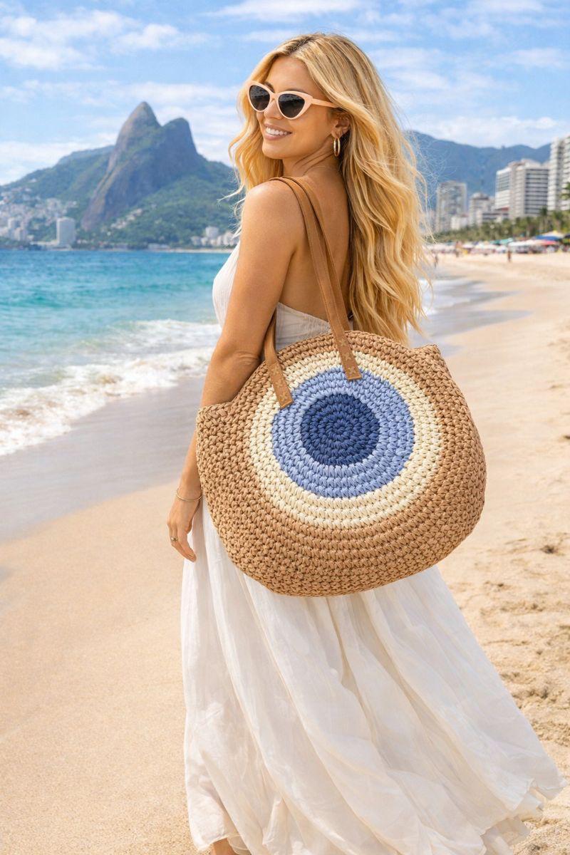 Divino en fibras naturales y diseno de ojo turco, este bolso es forrado y con cierre y lo usas para el día a día.