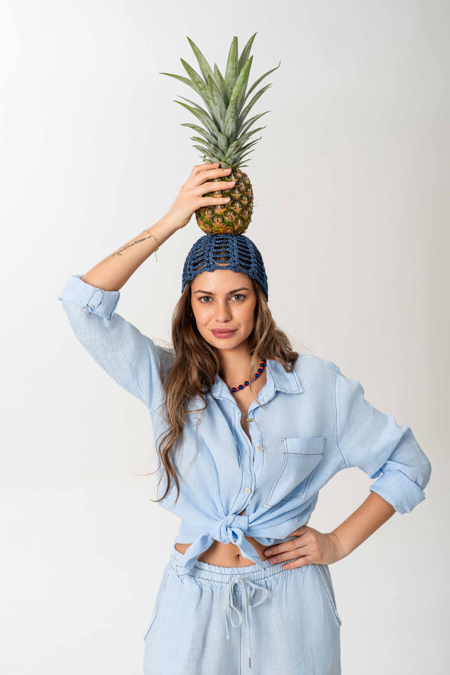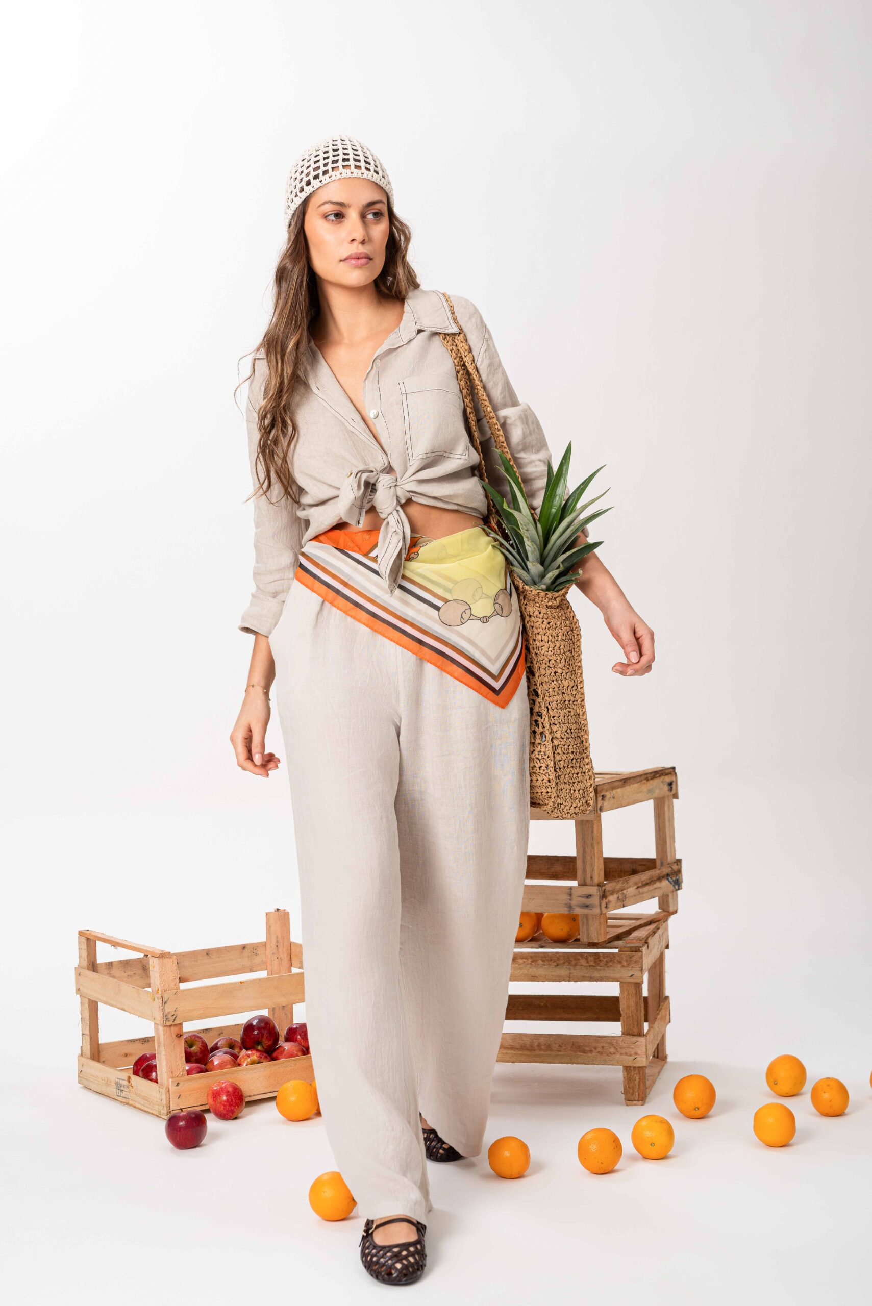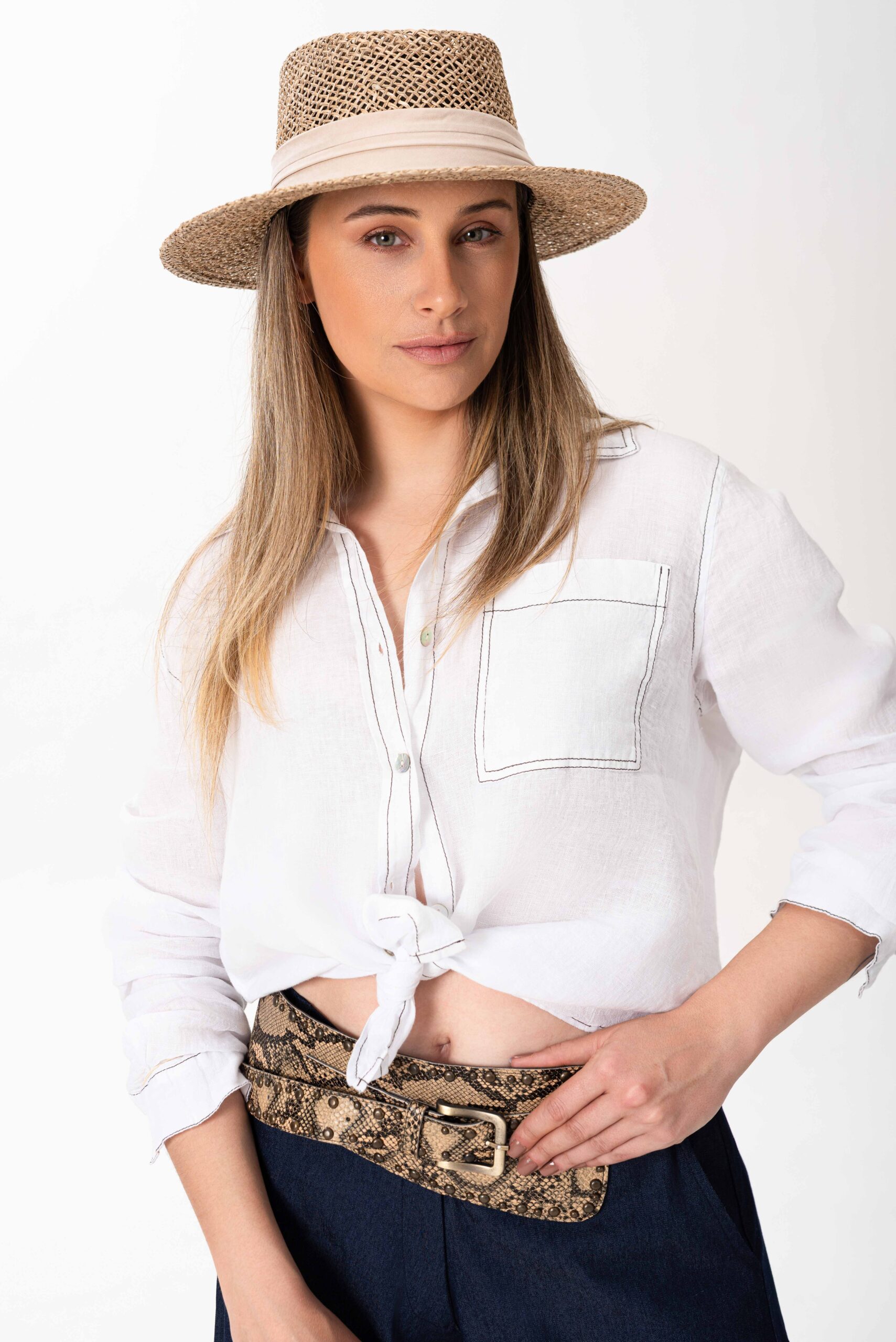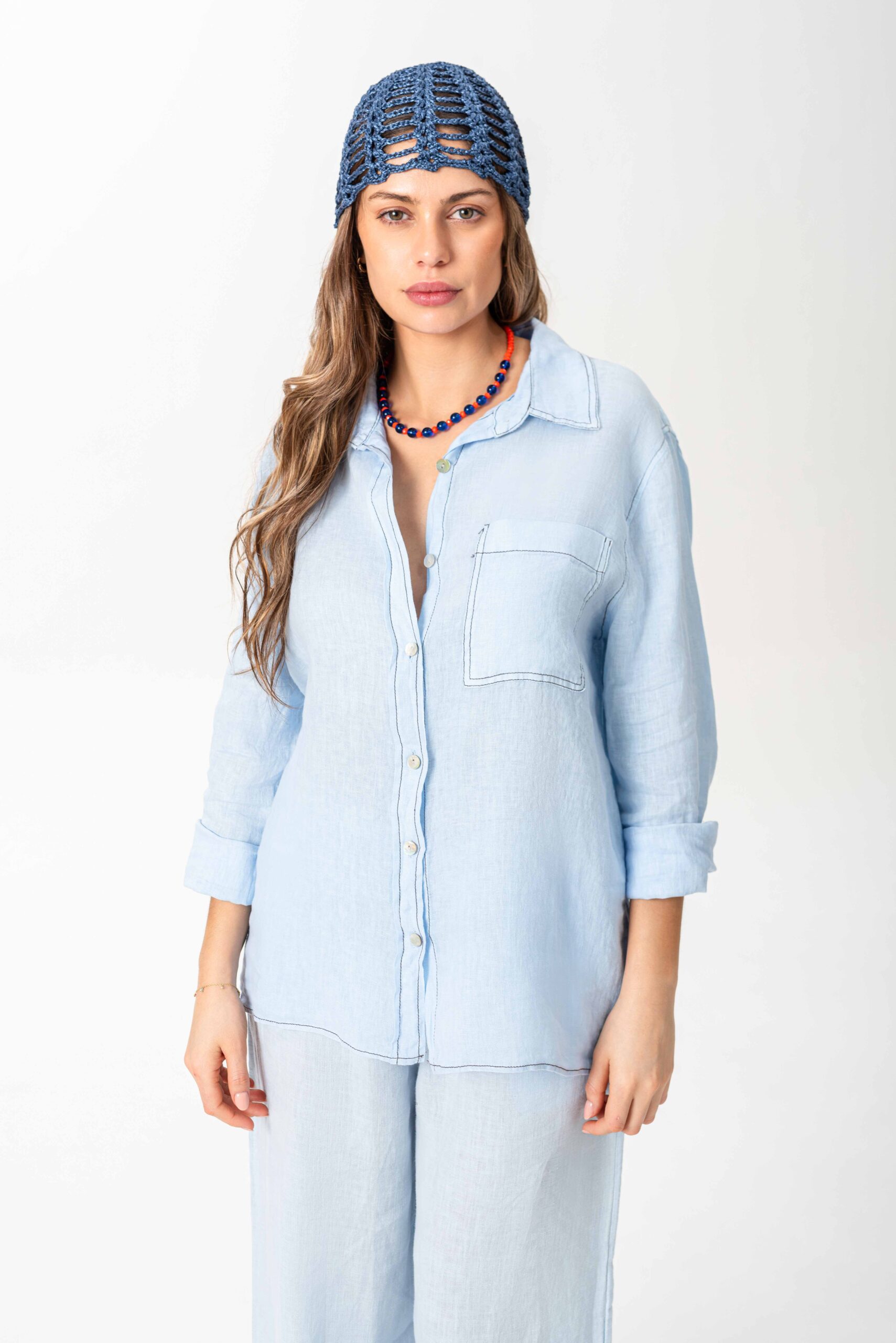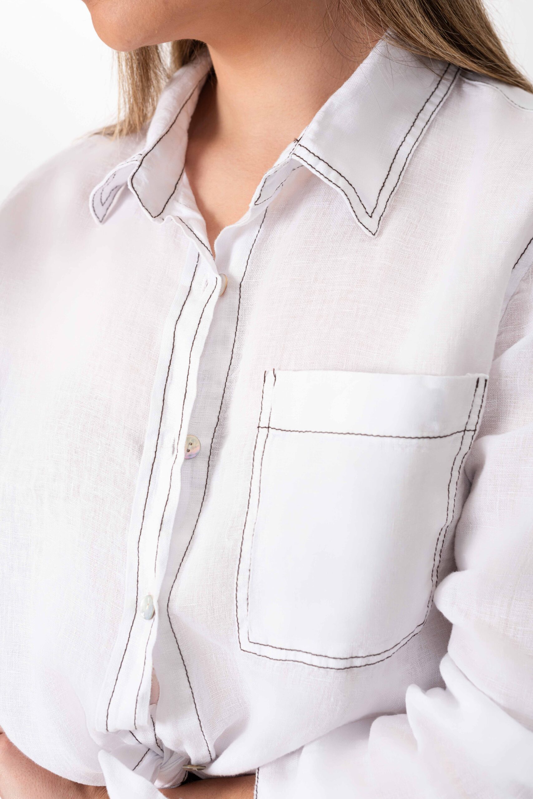 Divina Camisa atemporal realizada en 100% lino, con pespuntes en color chocolate. Talle único, sus medidas son 120 cms de contorno de busto y 68 cms de largo. Tiene un bolsillo al frente.