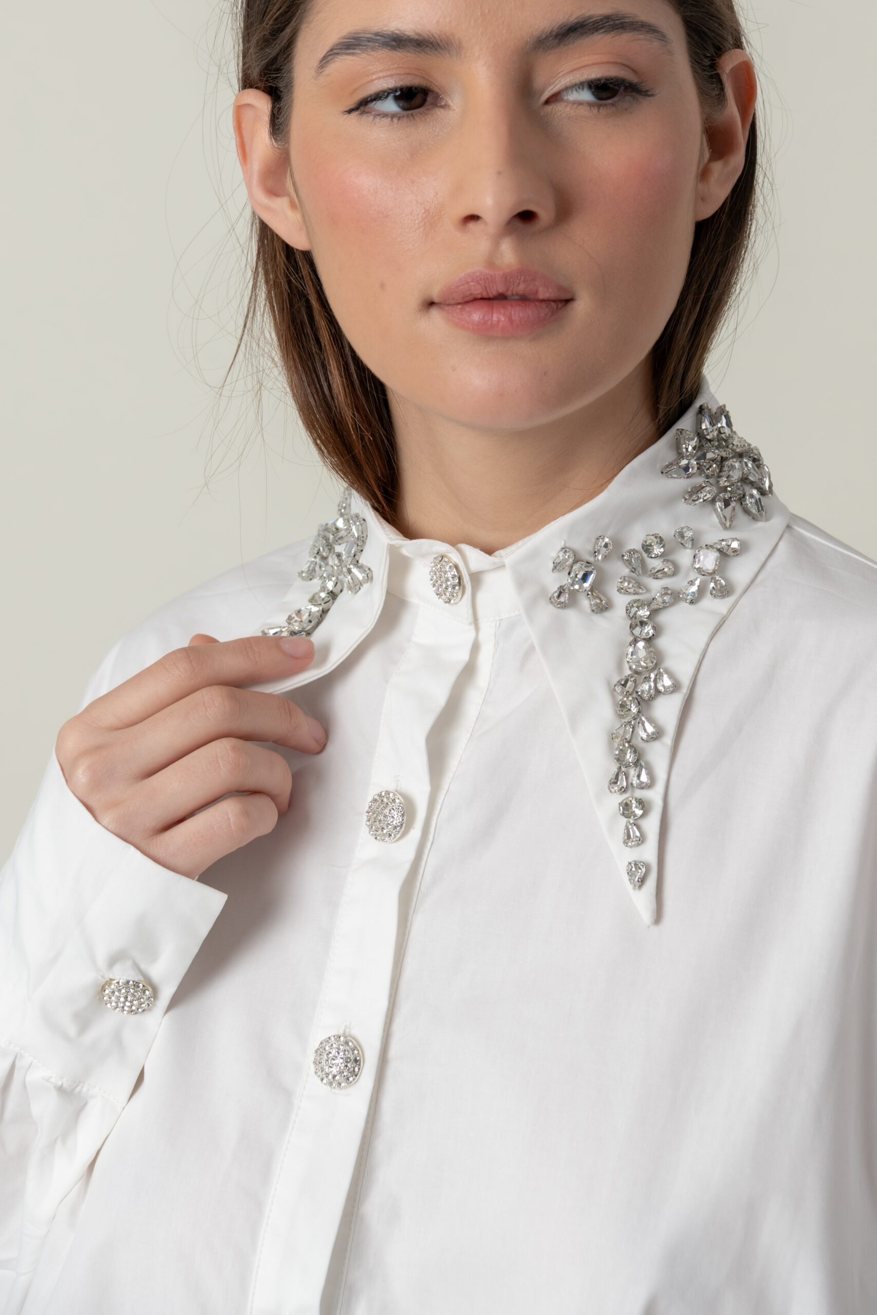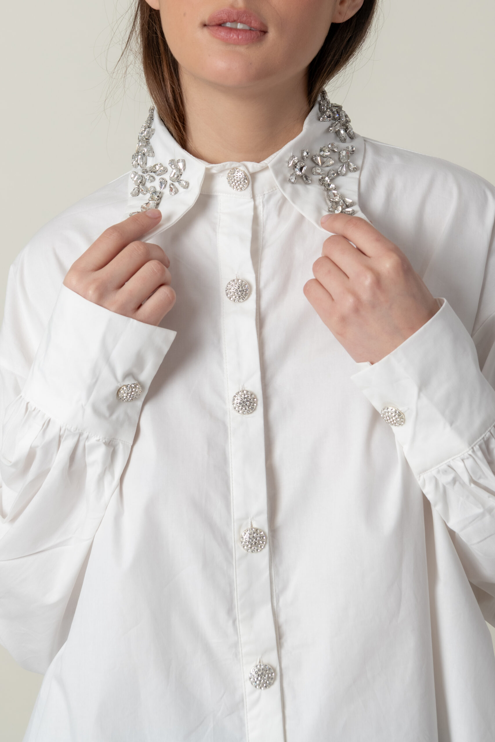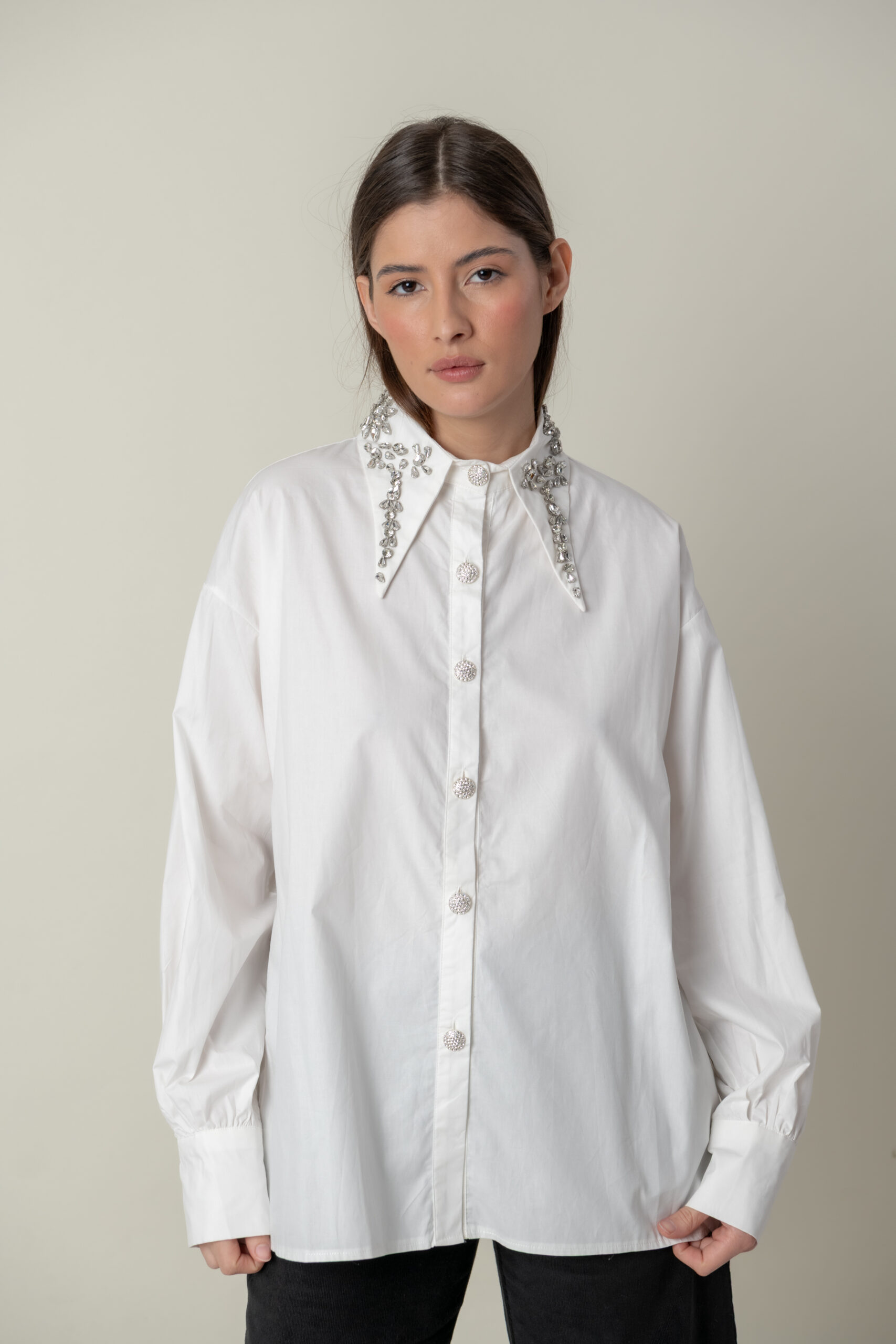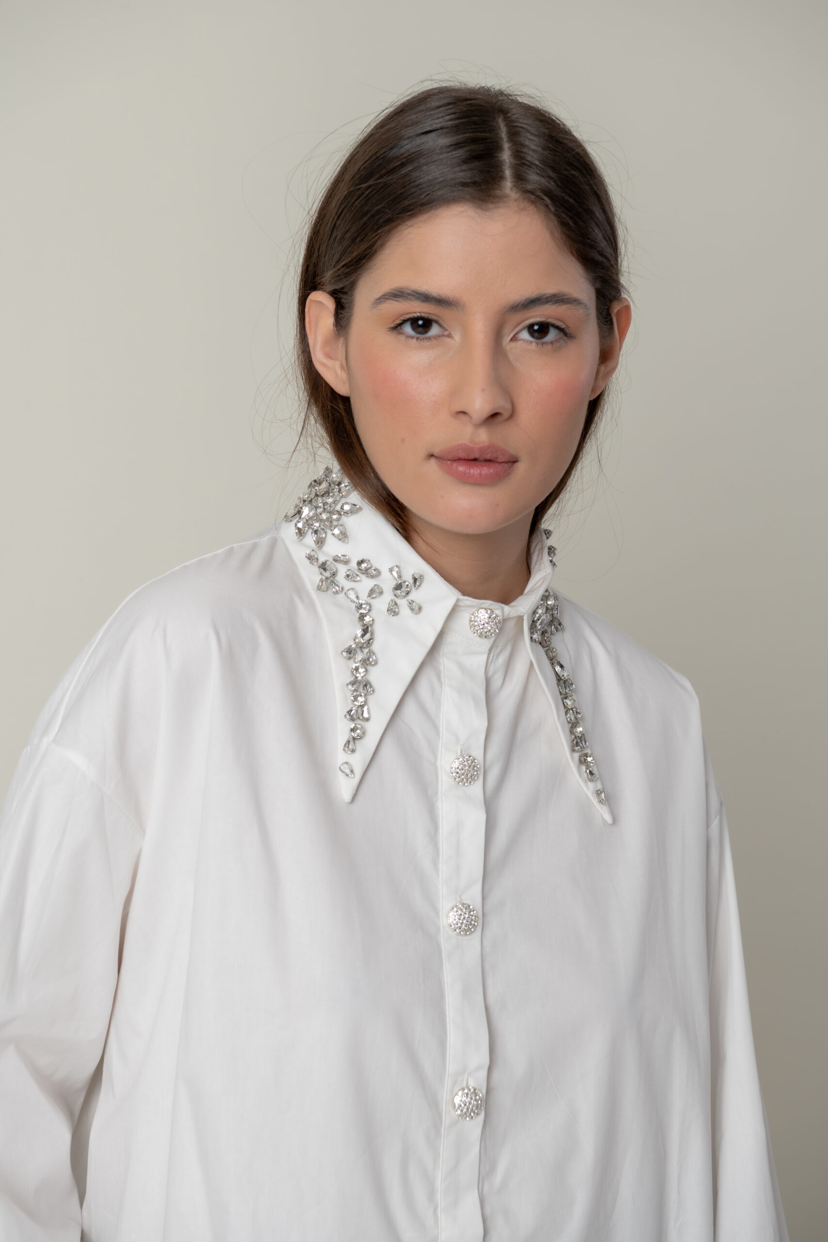 Divinas Camisas en Poliester, con gran detalle de bordado de Piedras en importante cuello y botones brillosos.