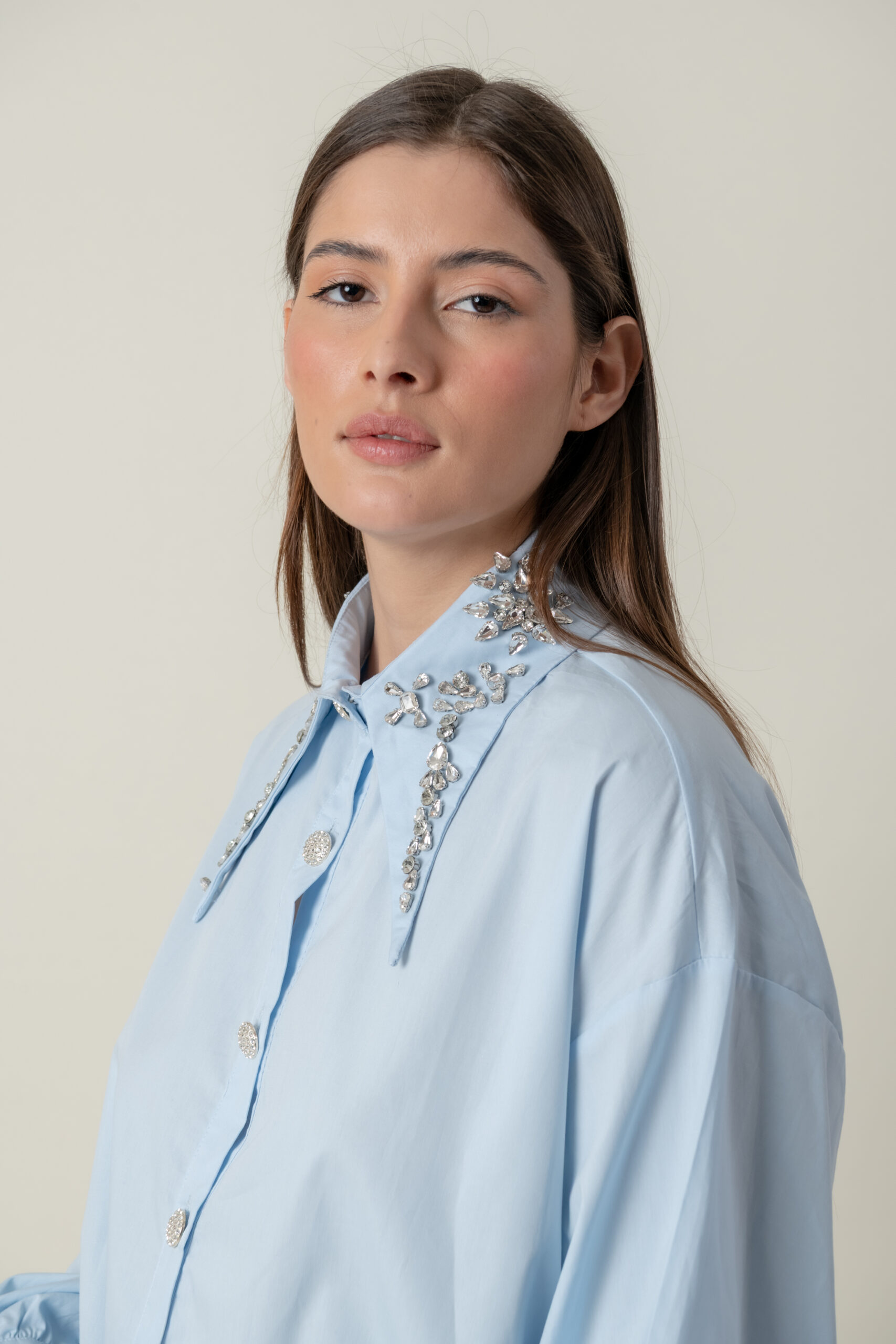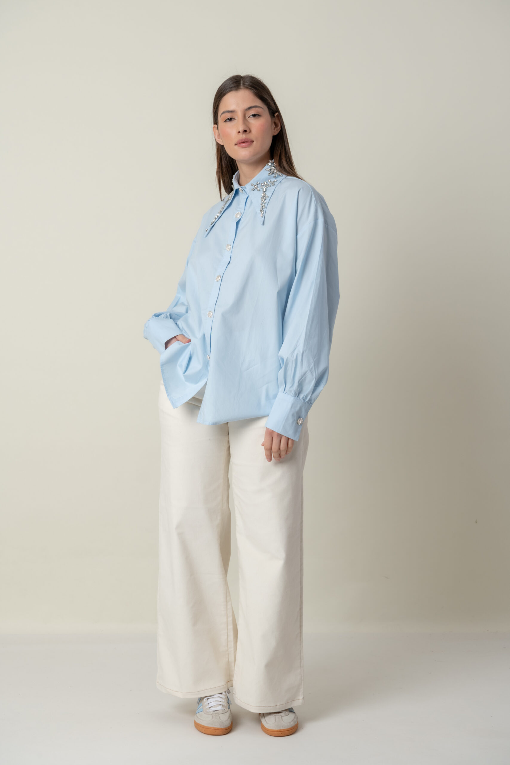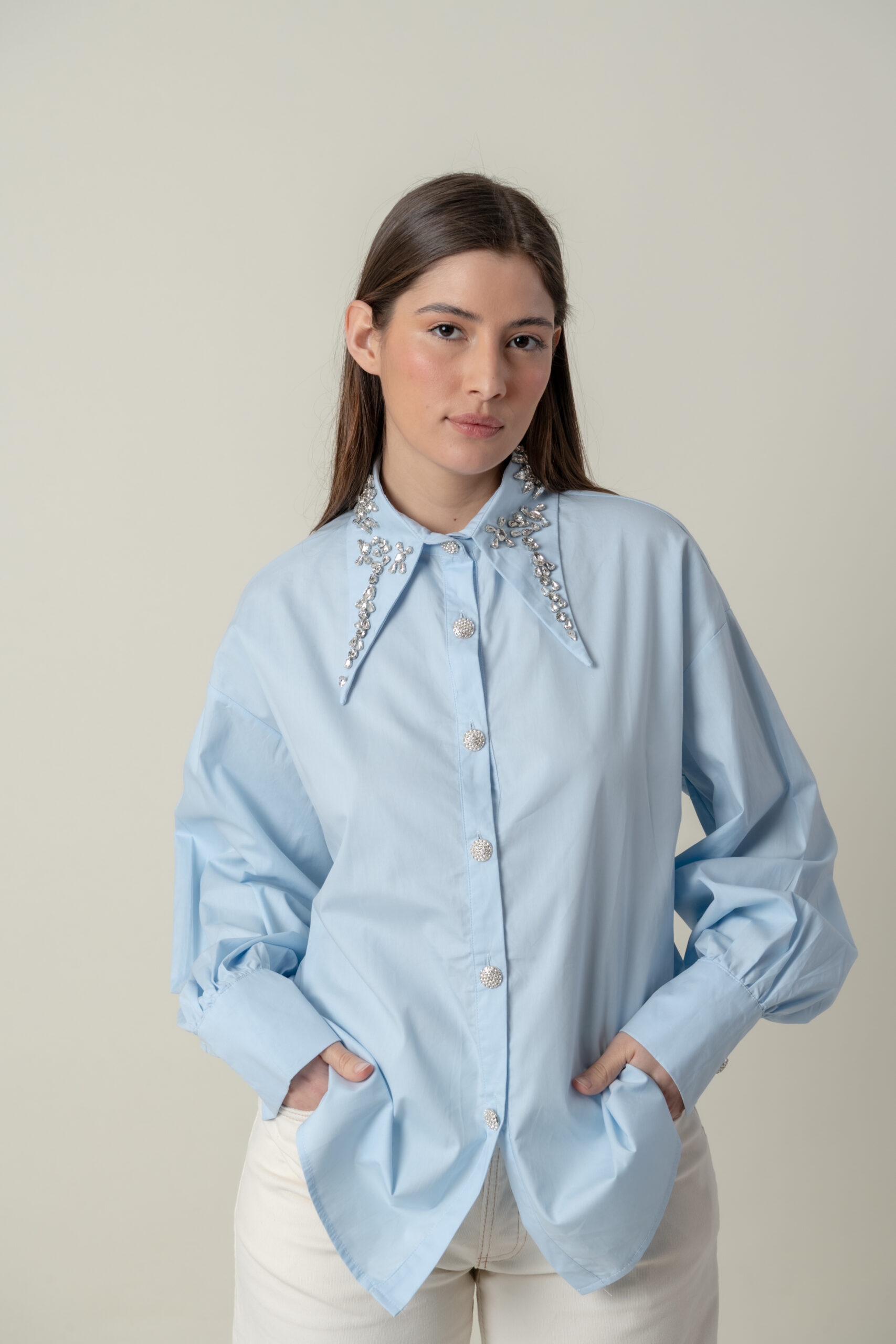 Divinas Camisas en Poliester, con gran detalle de bordado de Piedras en importante cuello y botones brillosos.
