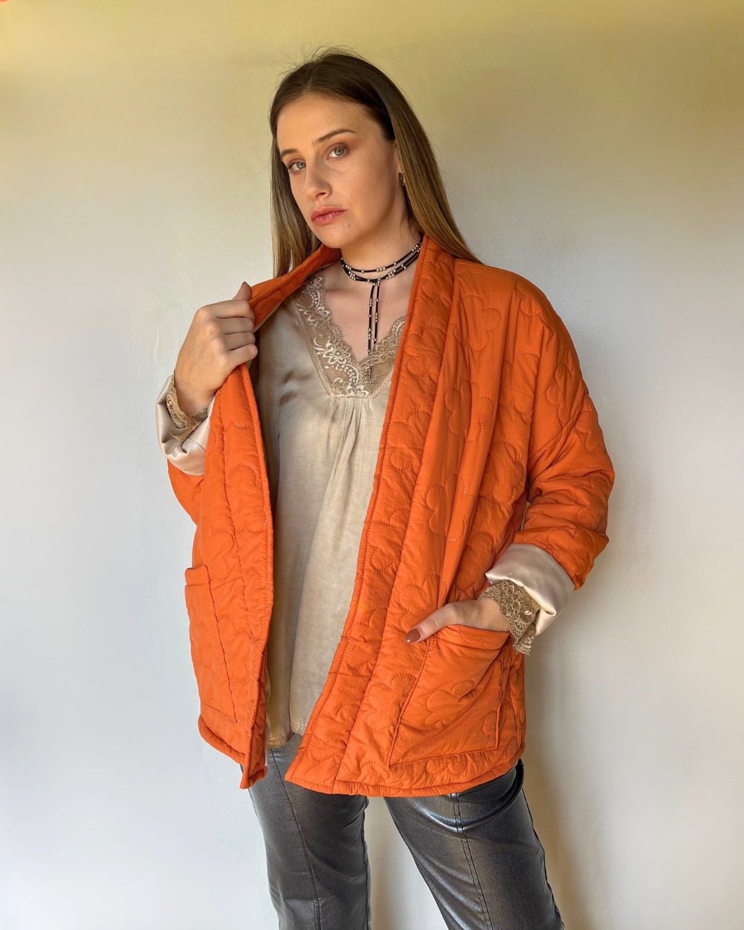 Campera Capitoneada forrada en satén beige con bolsillos en la delantera.