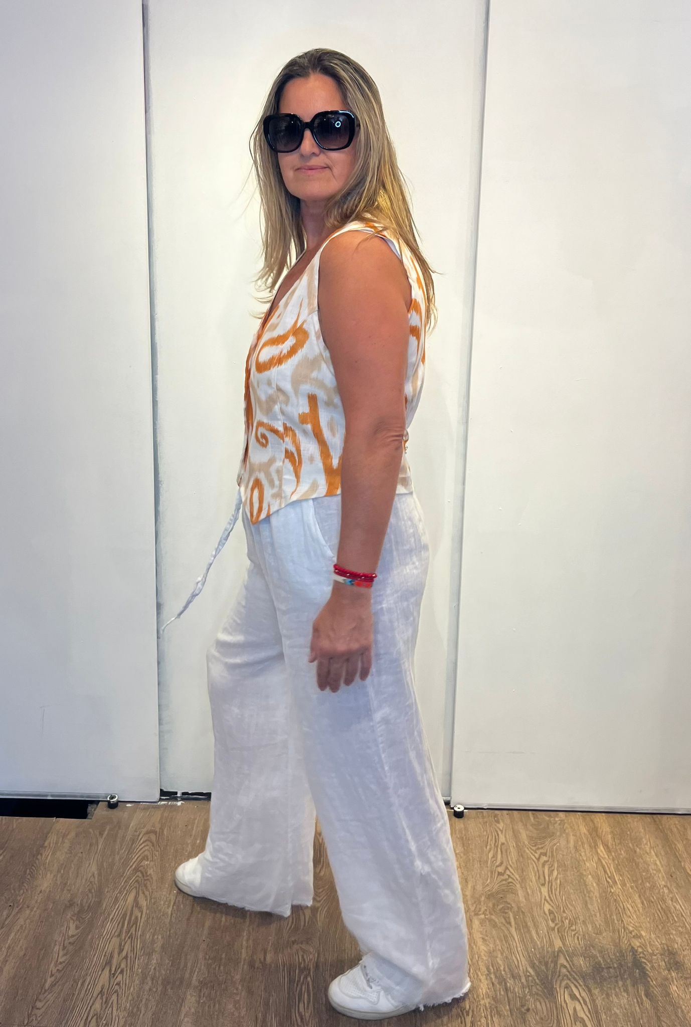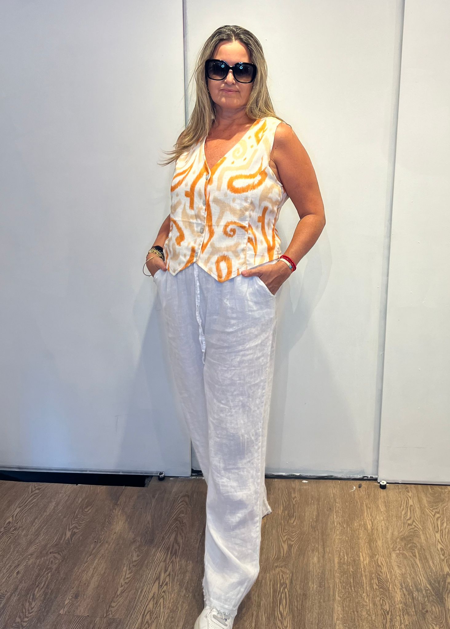 Divino Chaleco en Lino estampado. Cierra con botones de nácar y ajusta atrás con martingala.