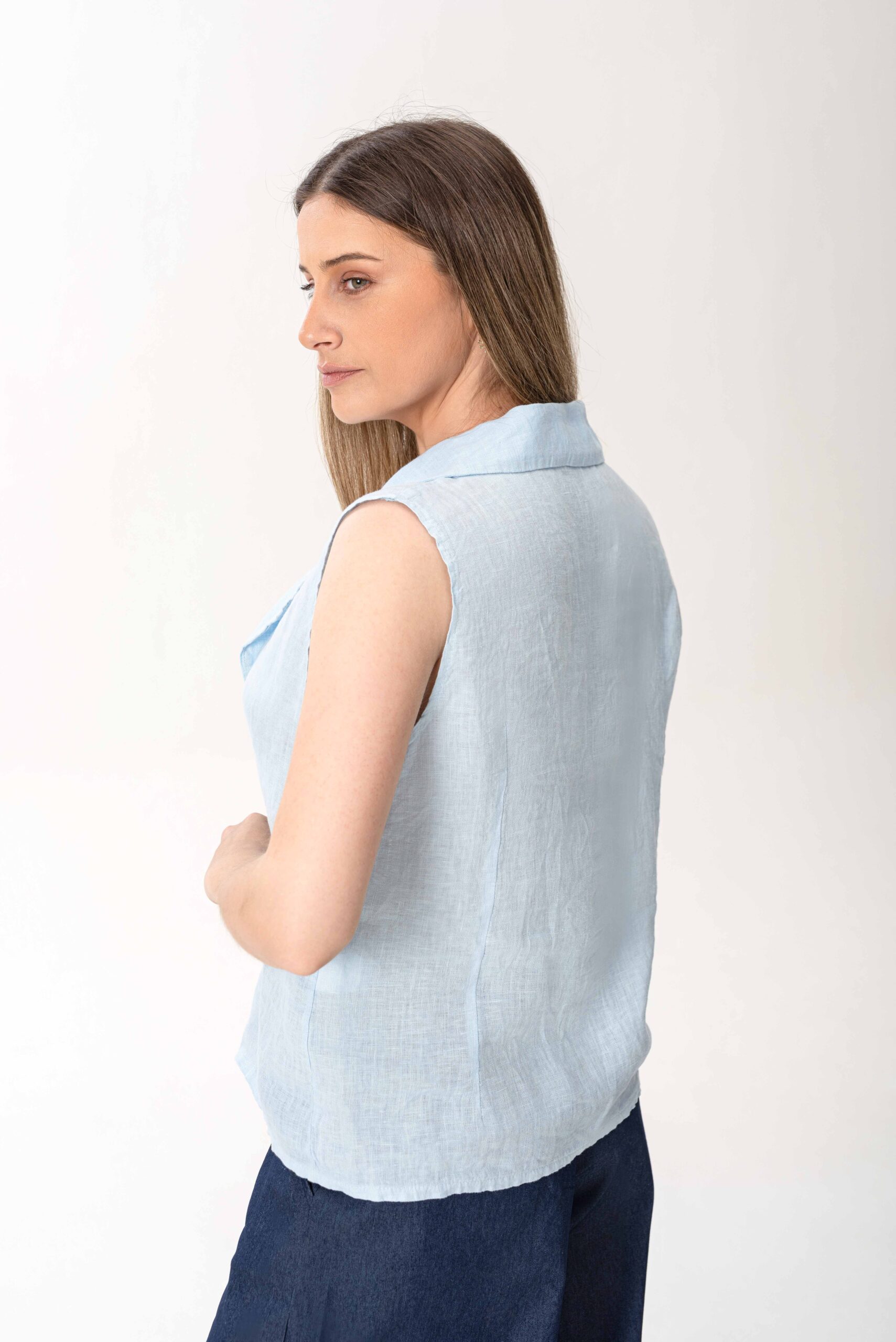 Chaleco en 100% lino corte blazer que cierra con botones y cuello solapa. Talle único, medidas 110 cms de contorno x 70 cms de largo.