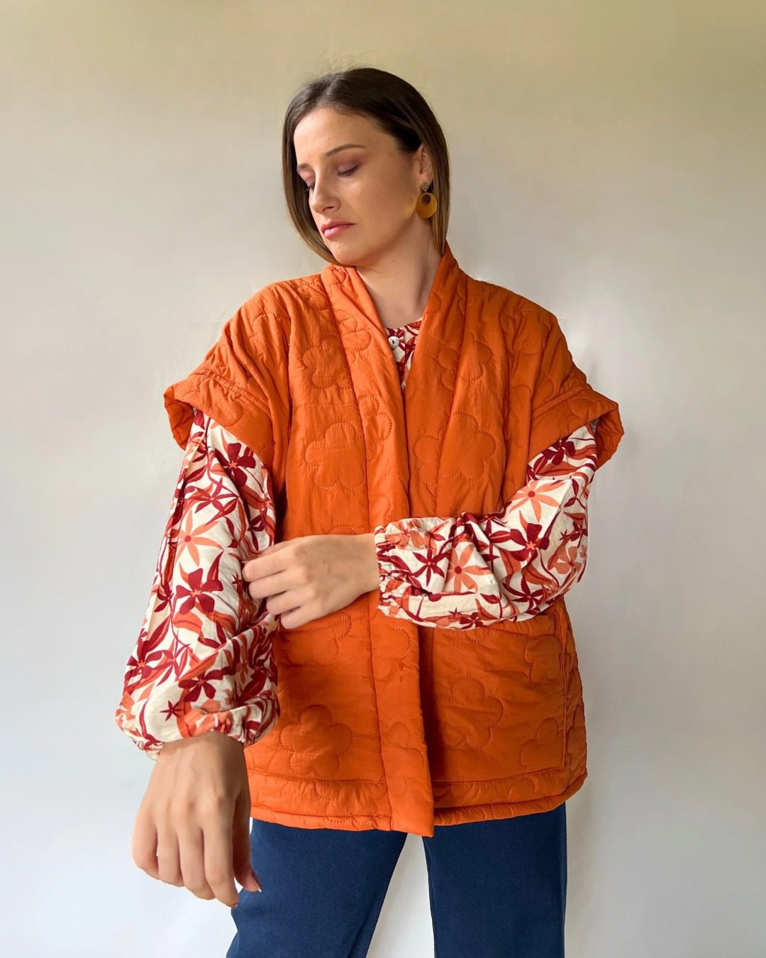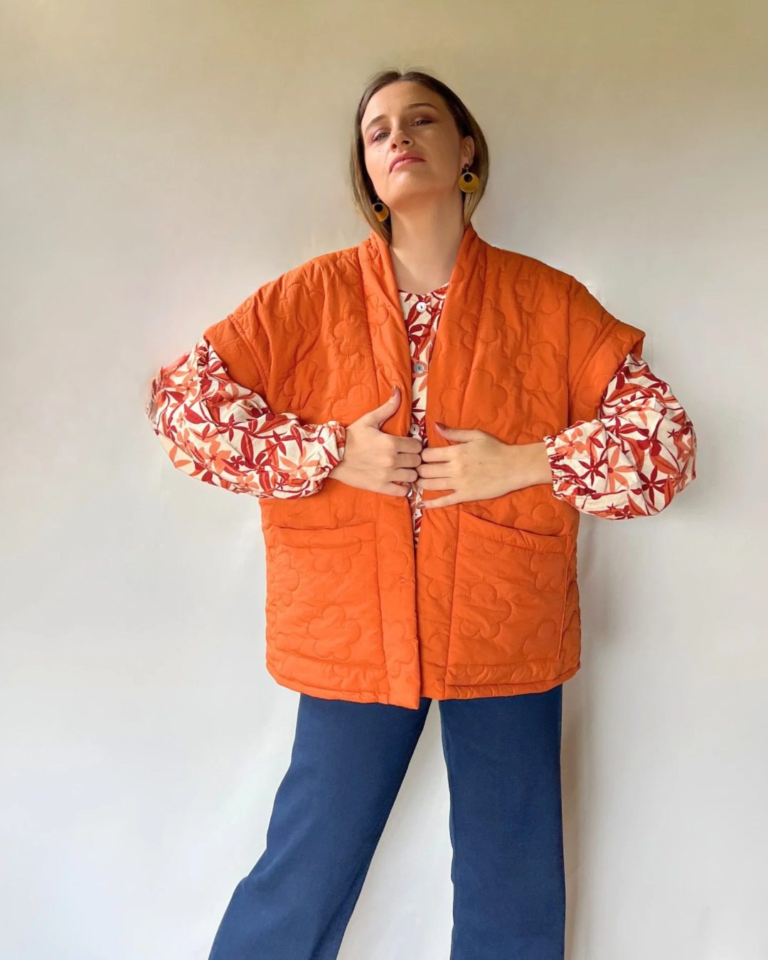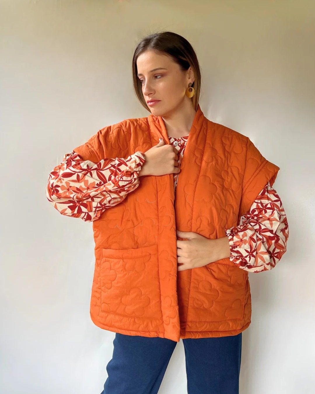 Capitoneado con diseno de flor, forrado en satén y oversize, divino chaleco con bolsillos, muy usable. En Tendencia!