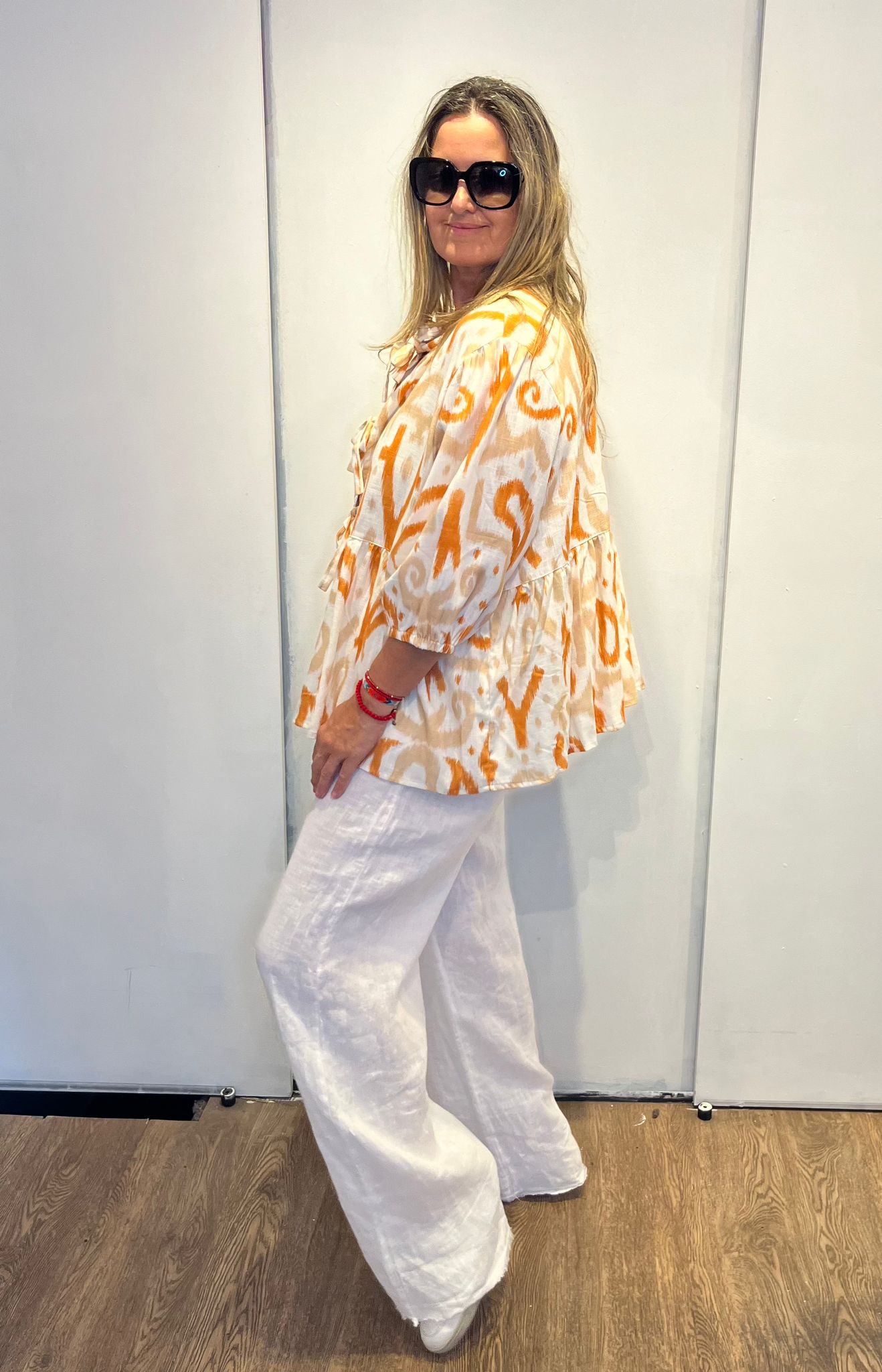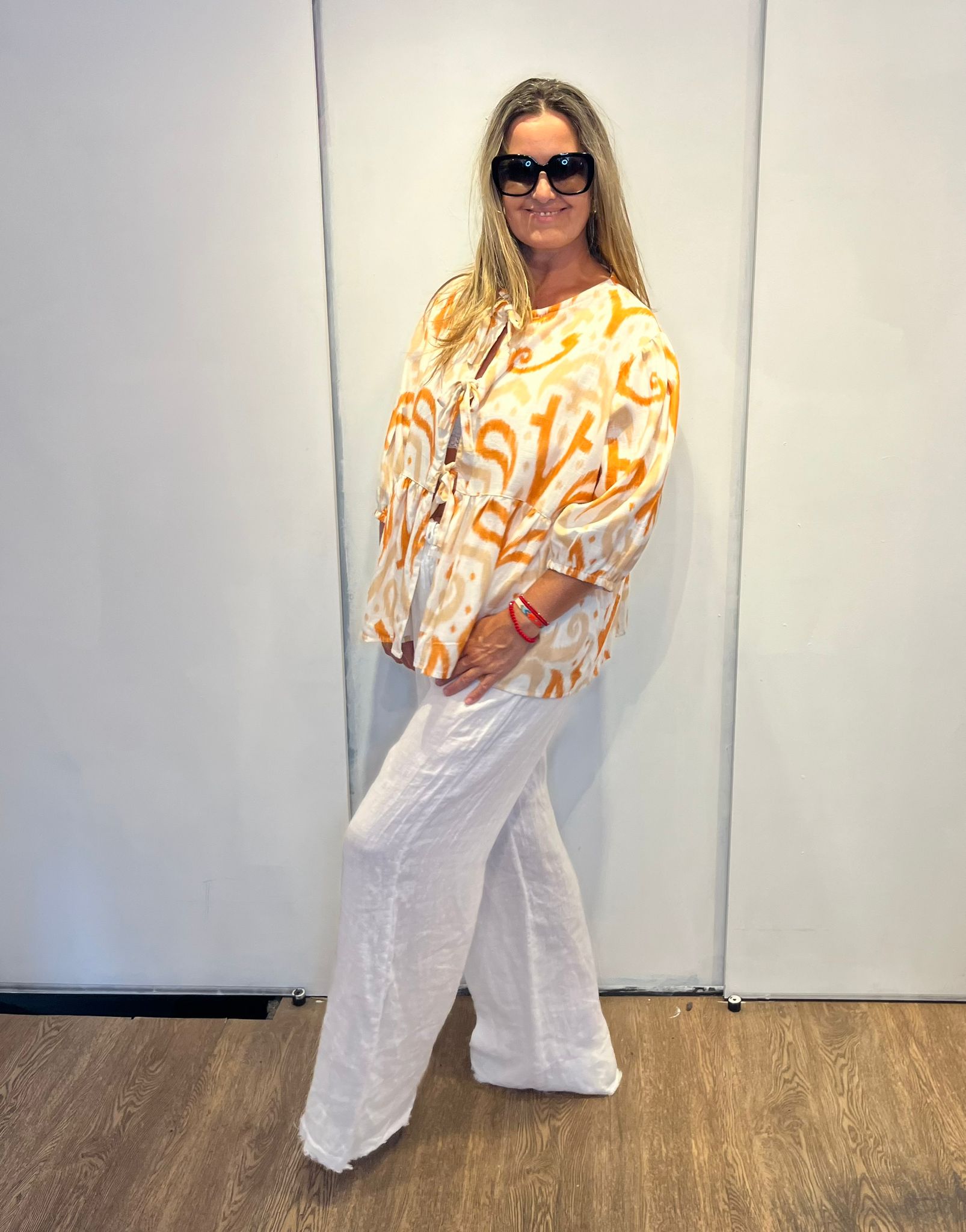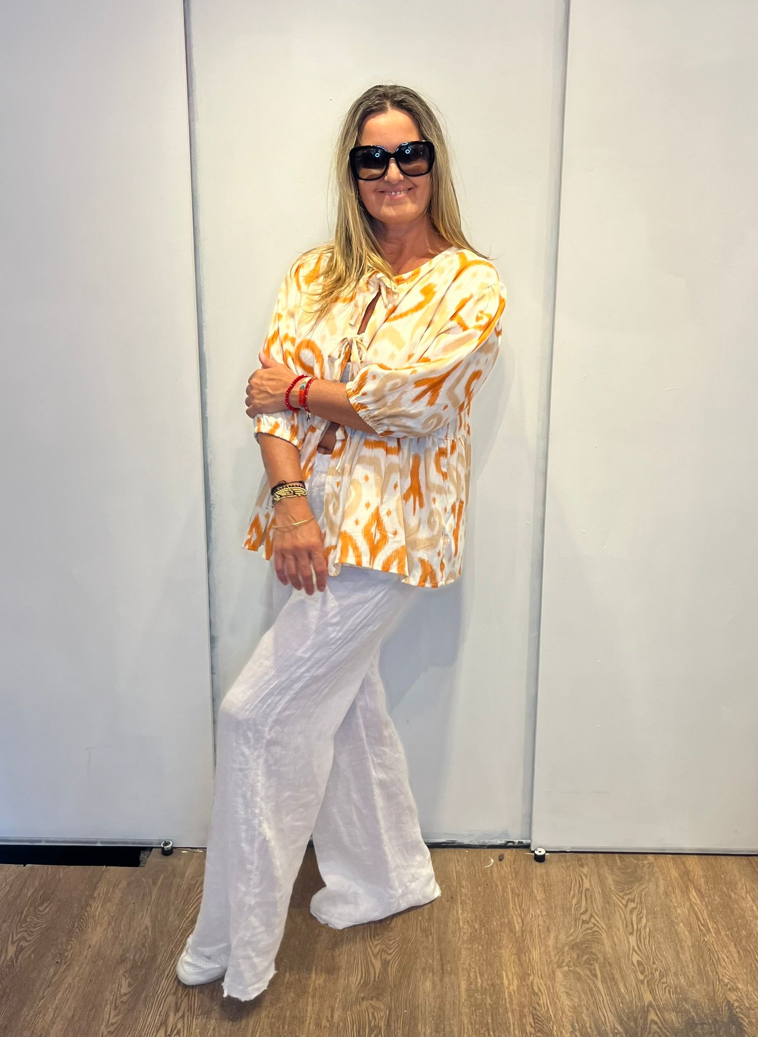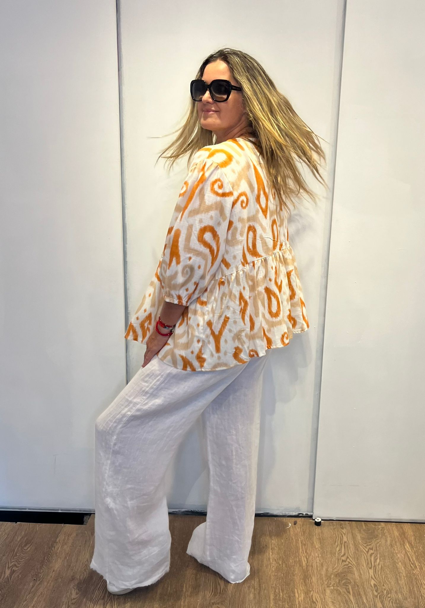 Divina chaqueta para usar sola o sobre una básica, realizada en lino estampada y mangas globo. Tiene 1 volado debajo y cierra con 3 tiras. En talle único que mide 140 cms de contorno y 64 cms de largo.