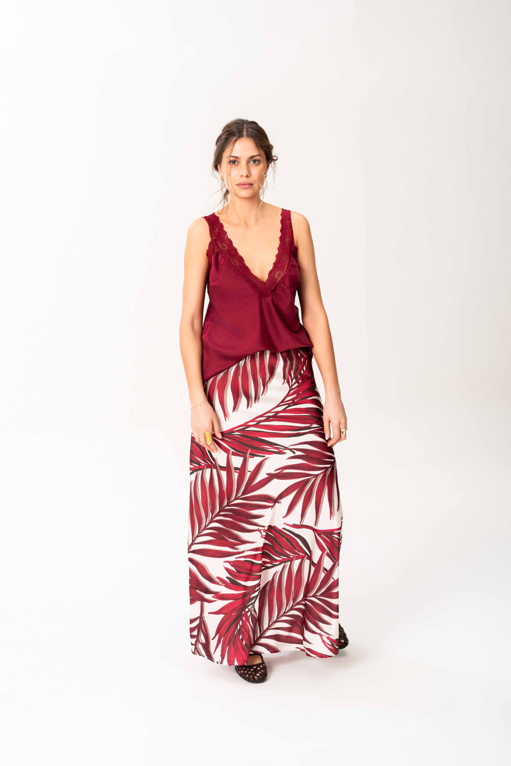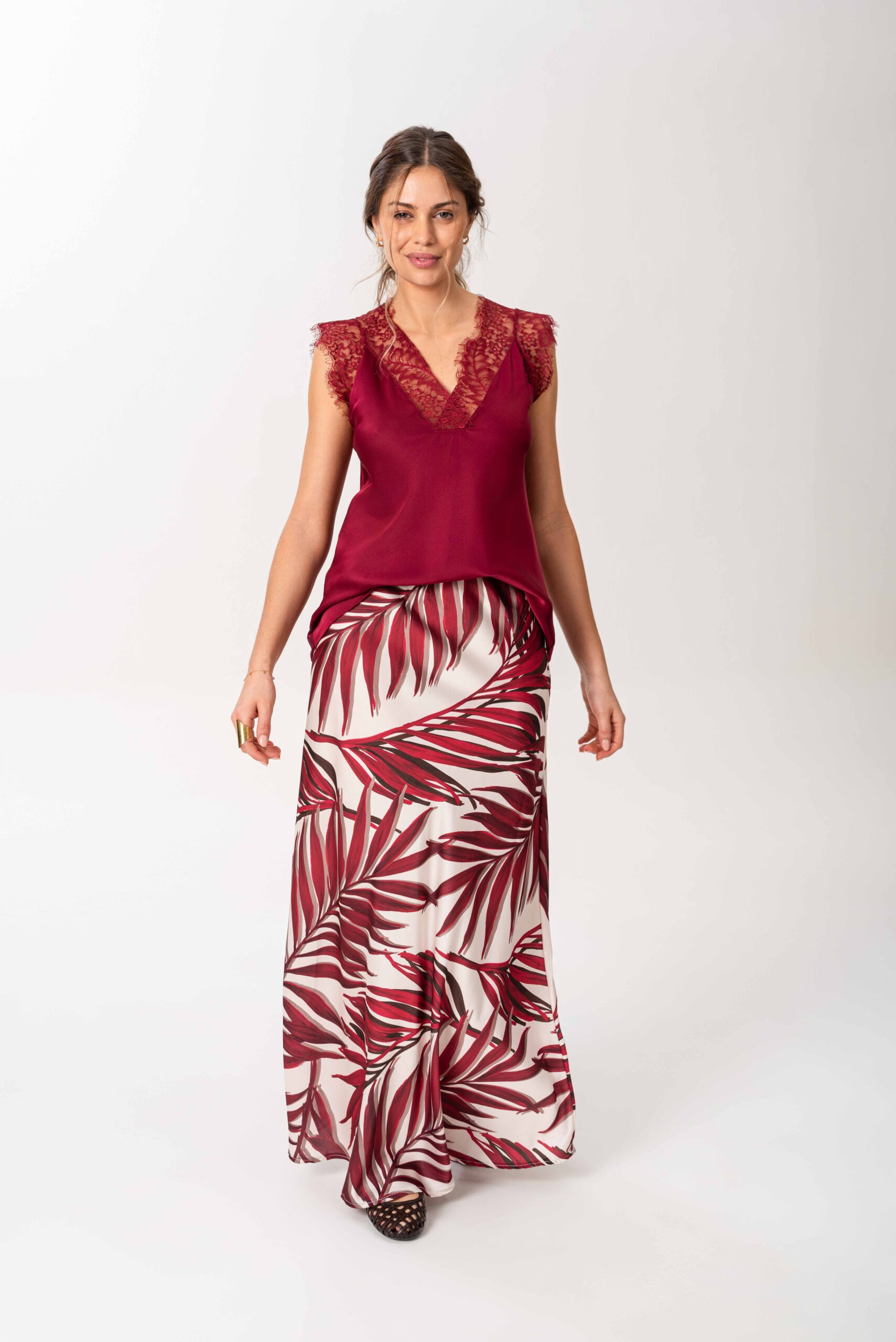 Divina falda estampada en bordó y chocolate, larga, versátil, para le día con championes y para la noche ideal con lenceras. Talle único, medidas 90 cms de cintura, 126 cms de cadera y 106 cms de largo.
