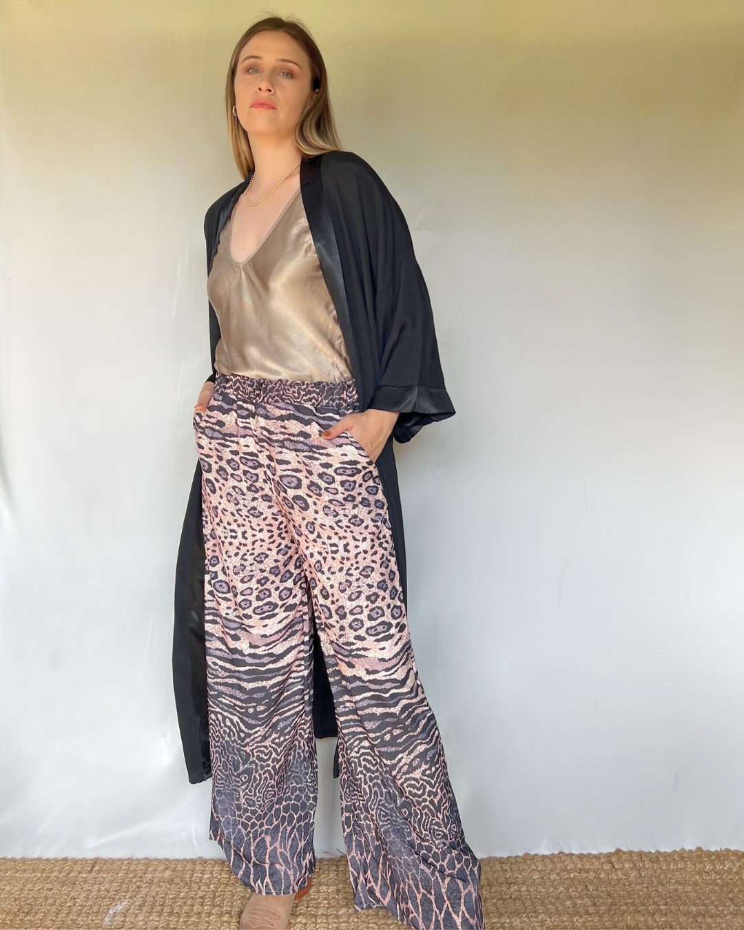 Pantalón en Satén, ancho, tipo palazzo, bolsillos y elástico en cintura con detalle de lazo.
