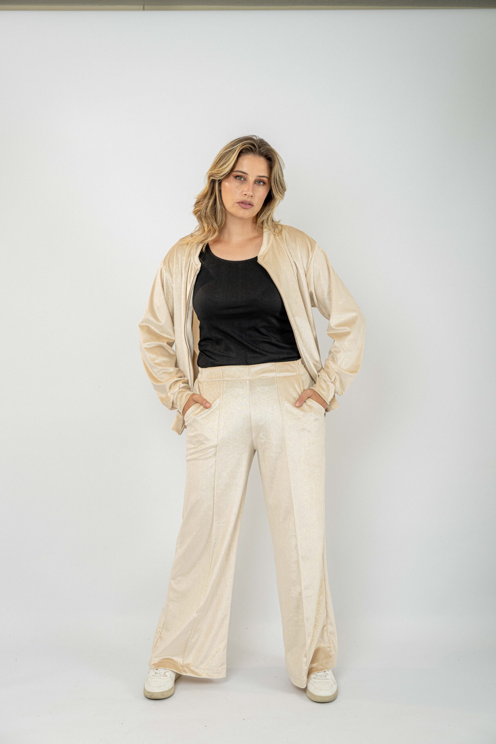 Pantalón realizado en terciopelo con Lurex, ancho, con bolsillos y elástico en cintura.