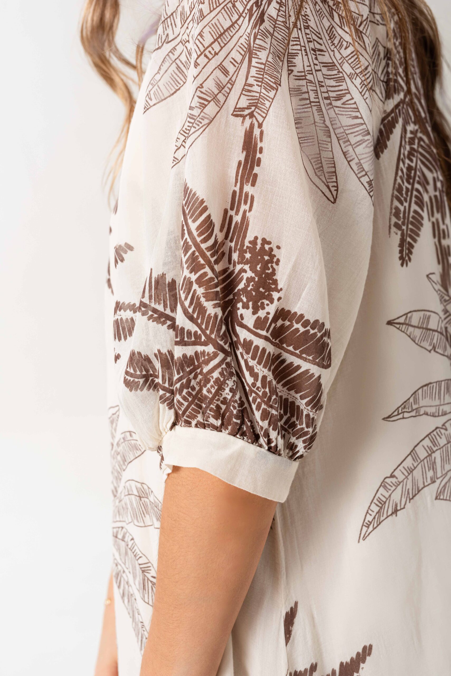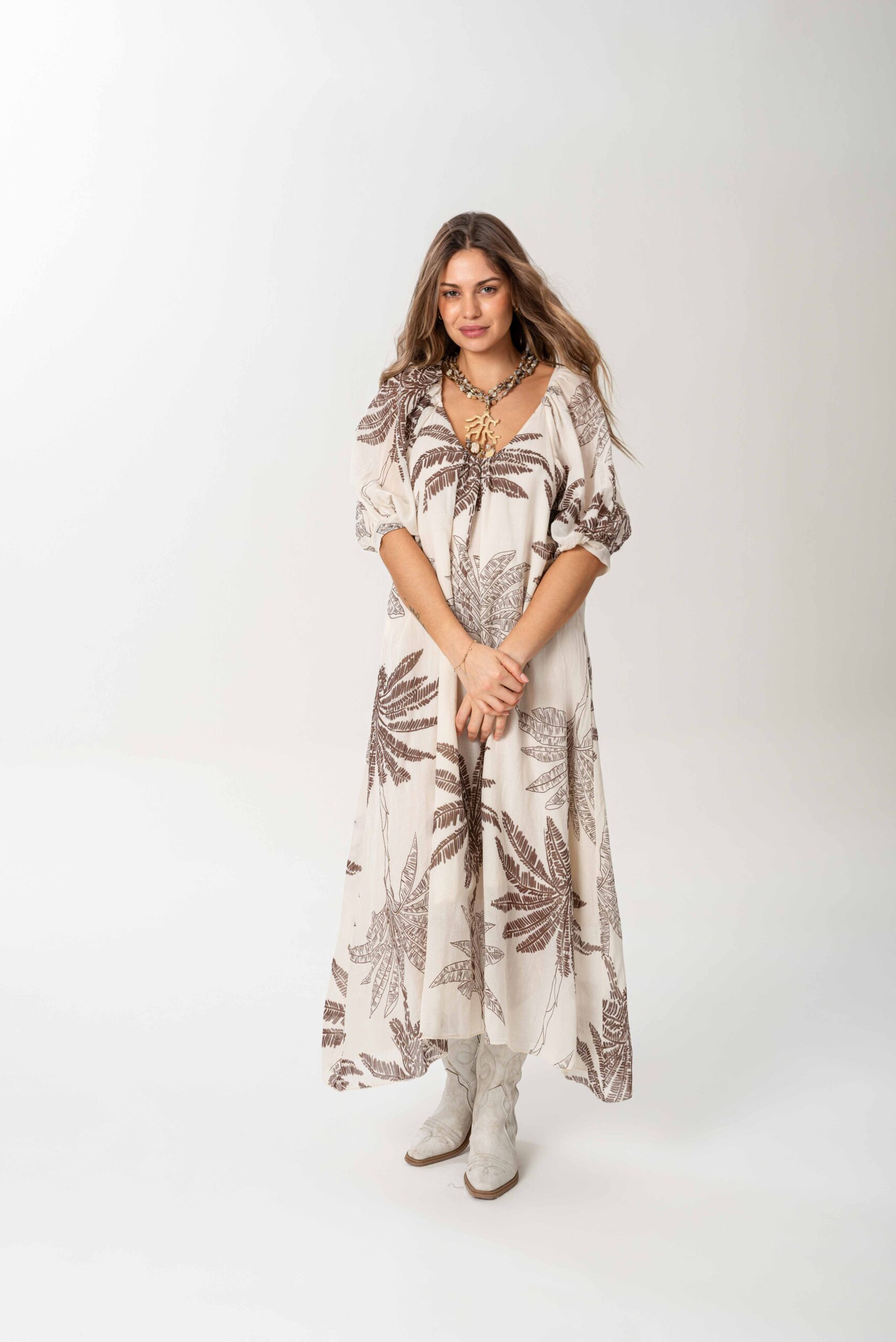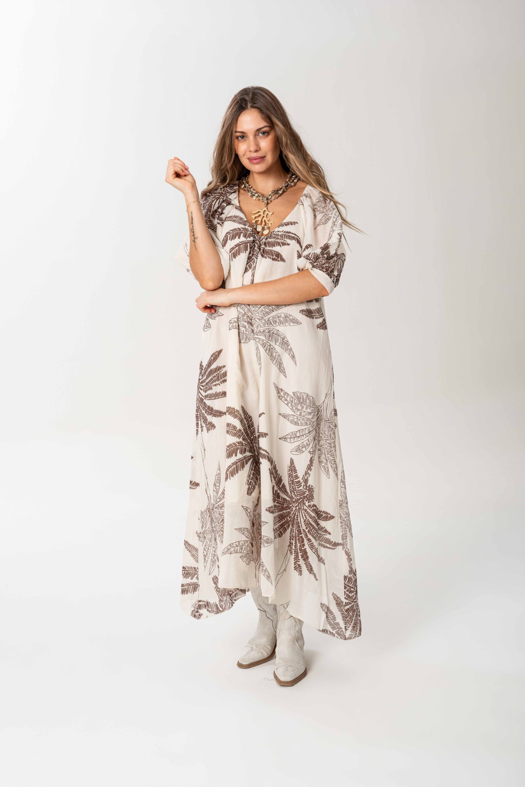Imponente vestido forrado en tonos arena y diseno de palmeras en tostado. Escote en V y mangas globo. Talle único, medidas de contorno de busto 106 cms y 120 cms de largo. único!!